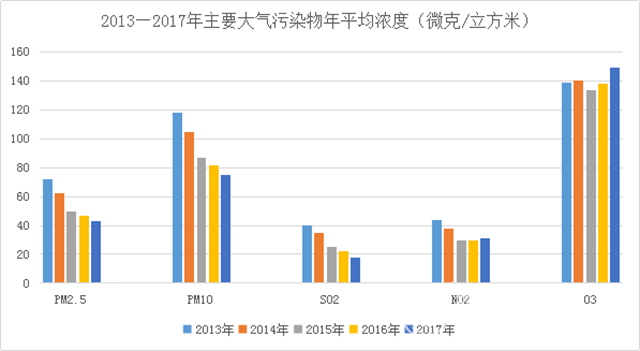 這5年,主要大氣污染物年平均濃度整體呈下降趨勢。